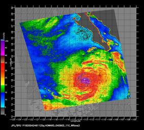 | Keywords: Hurricane Howard, Natural Hazards DVIDS842786.jpg en <p>The SeaWinds scatterometer aboard NASA's QuikSCAT satellite collected the data used to create this multicolored image of hurricane Howard off the Southern Coast of Cabo San Lucas Mexico This image taken on September 2nd at 4 25pm PDT shows near-surface winds 10 meters above the ocean surface </p> <p>The colored background shows the near-surface wind speeds at 2 5 km resolution with the highest wind speeds purple in the center and lower wind speeds around the outer edges of the storm The black barbs indicate wind speed and direction at QuikSCAT's nominal 25 km resolution; white barbs indicate areas of heavy rain </p> <p>The black grid marks out latitude and longitude The vertical lines of longitude start at 120 West on the left and go to 109 West with one line per degree The horizontal lines of latitude start at 15 degrees North on the bottom and run to 27 degrees North each line again indicating a single degree </p> <p>NASA's Quick Scatterometer winds jpl nasa gov QuikSCAT spacecraft was launched from Vandenberg Air Force Base California on June 19 1999 QuikScat carries the SeaWinds scatterometer a specialized microwave radar that measures near-surface wind speed and direction under all weather and cloud conditions over the Earth's oceans </p> <p>In recent years the ability to detect and track severe storms has been dramatically enhanced by the advent of weather satellites Data from the SeaWinds scatterometer is augmenting traditional satellite images of clouds by providing direct measurements of surface winds to compare with the observed cloud patterns in an effort to better determine a hurricane's location direction structure and strength Specifically these wind data are helping meteorologists to more accurately identify the extent of gale-force winds associated with a storm while supplying inputs to numerical models that provide advanced warning of high waves and flooding </p><p>NASA image courtesy the winds jpl nasa gov QuikSCAT team at NASA's Jet Propulsion Laboratory </p> NASA Identifier Howard_QST_2004246 <br>Unit NASA 2011-07-25 Glenn Research Center https //www dvidshub net/image/842786/hurricane-howard-natural-hazards 842786 2013-02-08 09 19 WASHINGTON D C US PD-USGov Vandenberg Air Force Base Images from DoD uploaded by Fæ |