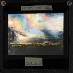 | Keywords: "Hurricane Sky", Calabar, late 19th century (imp-cswc-GB-237-CSWC47-LS2-018).jpg en <br> Hurricane Sky Calabar late 19th century Image of a stormy sky over Calabar The image shows dark clouds over a flat landscape The sky is also lit by reds yellows and greens ; Mary Slessor the Scottish missionary lost her hut to a Calabar tornado when it hit the village of Ibaka Photographer Unknown Filename imp-cswc-GB-237-CSWC47-LS2-018 tif Coverage date circa 1880 Part of collection International Mission Photography Archive ca 1860-ca 1960 Type images Part of subcollection Photographs from the Centre for the Study of World Christianity University of Edinburgh U K ca 1900-ca 1940s Repository name Centre for the Study of World Christianity Archival file impaunpub_Volume7/1291 url Repository address The University of Edinburgh School of Divinity New College Mound Place Edinburgh EH1 2LX United Kingdom Geographic subject country Nigeria Format aacr2 1 lantern slide 8 x 8 cm Geographic subject continent Africa Rights Contact the repository for details Part of series Mary Slessor LS2 Repository email divinity-CSWC ed ac uk Subject lcsh Keyword Storms Date created circa 1880 Publisher of the digital version University of Southern California Libraries Subject aat genre landscapes representations Format aat lantern slides Legacy record ID impa-m68161 Access conditions http //www ed ac uk/schools-departments/divinity/research/centres/world-christianity/collections-resources File GB 237 CSWC47/LS2/18 1880 author http //digitallibrary usc edu/cdm/ref/collection/p15799coll123/id/64414 PD-old-70-1923 Magic lantern images Images from USC Digital Library uploaded by Fæ International Mission Photography Archive ca 1860-ca 1960 Calabar |