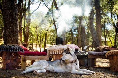 Keywords: husky dog animal pet white domestic mammal outdoors relaxing canine furry pillows wood benches trees forest woods smoke nature