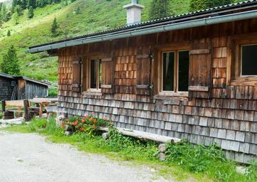 Keywords: hut summer hiking wood flowers wooden bench window wooden windows shutters log cabin mountains alm nature
