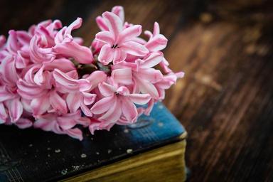 Keywords: hyacinth book flower flowers pink old book used wood wooden table close