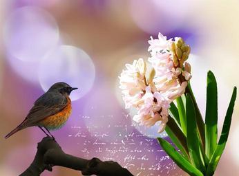Keywords: hyacinth flower blossom bloom plant common redstart throttle bird handwriting bokeh romantic spring composing digital art painting digital painting greeting card