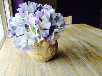 Keywords: hydrangea purple flowers rustic wood table