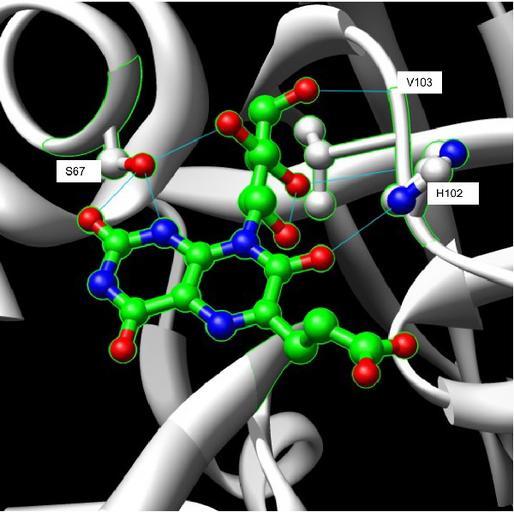 | Keywords: Hydrogen Bonding N-Terminal Domain.jpg en Hydrogen bonding at the N-terminal domain of the enzyme riboflavin synthase PDB 1Kzl Organism S Pombe substrate carboxyethyllumazine Own PERod 12/11/08 Check categories 2008 December 19 en wikipedia Riboflavin_synthase Enzymes |