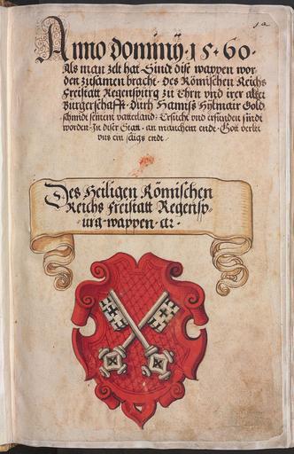 | Keywords: Hylmairs Wappenbuch cmg2015 001a.jpg Hans Hylmair's Goldschmids Regensburgisches Wappenbuch München Bayerische Staatsbibliothek Signatur Cgm 2015 http //nbn-resolving de/urn/resolver pl urn urn nbn de bvb 12-bsb00082261-1 1560 Hans Hylmair PD-old-100 Hans Hylmairs Regensburgisches Wappenbuch Coats of arms of Regensburg |