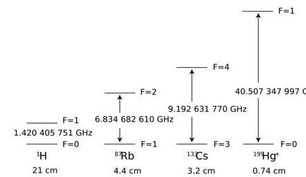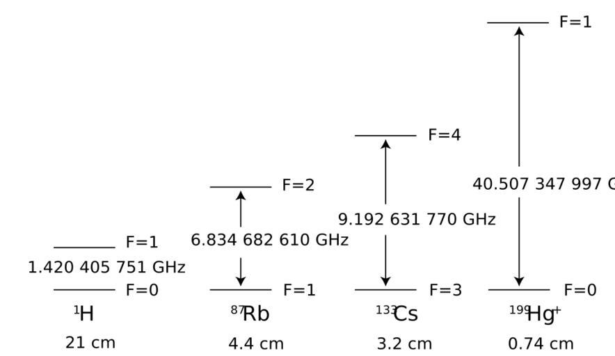 Keywords: Hyperfineilliustration.svg Drawing showing the hyperfine transitions within the ground state of four types of atom used for making atomic clocks Own 2007-12-04 Whosaskingeh Atomic clocks