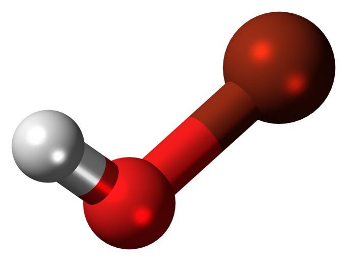 Keywords: Hypobromous acid molecule ball.png Ball-and-stick model of the hypobromous acid molecule an oxoacid of bromine in an oxidation state of +1 Color code F0F0F0 Hydrogen H white<br> F51E1E Oxygen O red<br> B42814 Bromine Br red-brown<br> 2011-11-21 own DS Visualizer Jynto talk Space-filling version cc-zero Images by Jynto Ball-and-stick models Hypobromous_acid |