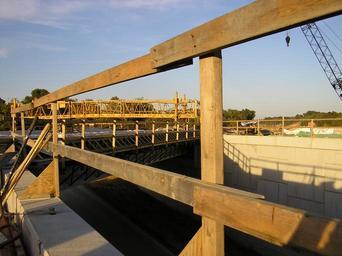 | Keywords: i-69 i69 interstate 69 interstate69 indiana monroe county monroecounty road bridge construction interstate freeway infrastructure e. s. wagner co. eswagnerco concrete bridge deck finisher concretebridgedeckfinisher concrete A close-up view of the overpass that will carry southbound Interstate 69 over Rockport Road in southwestern Monroe County, Indiana; looking northeast. The yellow rig in the background is a concrete bridge deck finisher. This machine, set on dual railings that run the length of the overpass, uses a high-tech mechanized roller to level the concrete to set specifications, creating in the process a subtle centerline crown. E. S. Wagner Co., prime contractor (Indiana I-69 Project, Section 4, Segment 8). A close-up view of the overpass that will carry southbound Interstate 69 over Rockport Road in southwestern Monroe County, Indiana; looking northeast. The yellow rig in the background is a concrete bridge deck finisher. This machine, set on dual railings that run the length of the overpass, uses a high-tech mechanized roller to level the concrete to set specifications, creating in the process a subtle centerline crown. E. S. Wagner Co., prime contractor (Indiana I-69 Project, Section 4, Segment 8). |