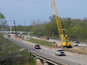 | Keywords: i-69 i69 interstate 69 interstate69 indiana monroe county monroecounty road bridge overpass construction infrastructure crane i-69 development partners i69developmentpartners isolux corsán usa isoluxcorsánusa state road 37 stateroad37 Section 5 — Griffy and Beanblossom creek work zone; Monroe County, Indiana Refurbishment and widening of the bridges that carry State Road 37 (future Interstate 69) over Griffy Creek (foreground) and Beanblossom Creek (background) in Monroe County, Indiana; looking north. Each span—4 in total—will be widened (in the median) to accommodate a third traffic lane in each direction. The overpass pictured in the background is used exclusively for exiting southbound SR 37 traffic to the city of Bloomington's N. Walnut Street. No change is planned for this partial interchange as SR 37 is upgraded to I-69. I-69 Development Partners. Isolux Corsán USA, prime contractor. (Indiana I-69 Corridor Project, Section 5). Section 5 — Griffy and Beanblossom creek work zone; Monroe County, Indiana Refurbishment and widening of the bridges that carry State Road 37 (future Interstate 69) over Griffy Creek (foreground) and Beanblossom Creek (background) in Monroe County, Indiana; looking north. Each span—4 in total—will be widened (in the median) to accommodate a third traffic lane in each direction. The overpass pictured in the background is used exclusively for exiting southbound SR 37 traffic to the city of Bloomington's N. Walnut Street. No change is planned for this partial interchange as SR 37 is upgraded to I-69. I-69 Development Partners. Isolux Corsán USA, prime contractor. (Indiana I-69 Corridor Project, Section 5). |