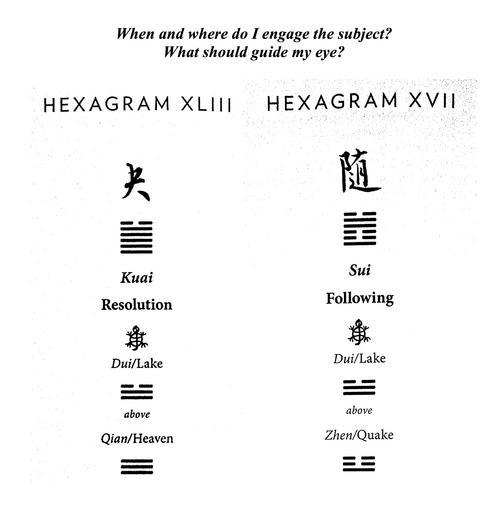 Keywords: With “heads” = 3, and “tails” = 2, three coins were thrown six times: _____2+2+3 = 7, Undivided Line (Young, or Unchanging, Yang) _____3+3+3 = 9, Undivided Line (Old, or Changing, Yang) _____3+3+3 = 9, Undivided Line (Old, or Changing, Yang) _____2+2+3 = 7, Undivided Line (Young, or Unchanging, Yang) _____2+2+3 = 7, Undivided Line (Young, or Unchanging, Yang) _____3+3+2 = 8, Divided Line (Young, or Unchanging, Yin) Building up from the bottom space, this yields the trigram 7/9/9 (Qian/Heaven transforming into Zhen/Quake) under the trigram 7/7/8 (Dui/Lake), and the resultant two hexagrams, displayed above. Chinese renderings from the translation by John Minford.