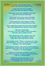 | Keywords: text screenshot I have seen the evil in men, and I have seen the good in men; I have seen the evil in myself, and I have seen the good in myself. I have seen many who intended to do good, but who ended up doing bad; I have seen how my own good intentions have often unexpectedly resulted in bad. I have heard the cries of agony of men, and I have heard the shouts of joy of men, And I myself have experienced the cries of agony, and I have experieced as well the times of joy. Well has it been said, "it is not in man who walks to direct his steps." Jeremiah 10:23, Green's Literal. How well did one write: "Surely every man at his best estate is altogether vanity." Psalm 39:5, New King James Version And another wrote: "What a wretched man I am! Who will deliver me out of the body of this death?" Romans 7:24, World English "The saying is faithful, and worthy of all acceptance, that Christ Jesus came into the world to save sinners." 1 Timothy 1:15, World English. "[Jesus] is the atoning sacrifice for our sins, and not for ours only, but also for the whole world." 1 John 3:3, World English. "Thanks be to God, who gives us the victory through our Lord Jesus Christ." 1 Corinthians 15:57, World English. I have posted a graphic of this at: wisdom.reslight.net/ihaveseen.html I have seen the evil in men, and I have seen the good in men; I have seen the evil in myself, and I have seen the good in myself. I have seen many who intended to do good, but who ended up doing bad; I have seen how my own good intentions have often unexpectedly resulted in bad. I have heard the cries of agony of men, and I have heard the shouts of joy of men, And I myself have experienced the cries of agony, and I have experieced as well the times of joy. Well has it been said, "it is not in man who walks to direct his steps." Jeremiah 10:23, Green's Literal. How well did one write: "Surely every man at his best estate is altogether vanity." Psalm 39:5, New King James Version And another wrote: "What a wretched man I am! Who will deliver me out of the body of this death?" Romans 7:24, World English "The saying is faithful, and worthy of all acceptance, that Christ Jesus came into the world to save sinners." 1 Timothy 1:15, World English. "[Jesus] is the atoning sacrifice for our sins, and not for ours only, but also for the whole world." 1 John 3:3, World English. "Thanks be to God, who gives us the victory through our Lord Jesus Christ." 1 Corinthians 15:57, World English. I have posted a graphic of this at: wisdom.reslight.net/ihaveseen.html |
