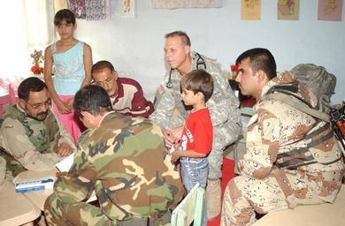 | Keywords: IA, MND-B Soldiers conduct medical operation DVIDS33047.jpg en BAGHDAD - A doctor from 5th Brigade 6th Iraqi Army Division fills out paperwork while examining a local resident as Capt Robert Hillerman a Multi-National Division - Baghdad physician's assistant watches on during a medical operation Saturday at the Al Karama Nursery School in western Baghdad Iraqi doctors nurses and medics provided free treatment for non-chronic illnesses and injuries and more than 600 community members were provided toys and food Soldiers from MND-B's 2nd Battalion 1st Infantry Regiment 172nd Stryker Brigade Combat Team based out of Fort Wainwright Alaska and 414th Civil Affairs Battalion provided medical and security assistance for the Iraqi Army medical personnel U S Army photo courtesy of 172nd SBCT MND-B 2006-11-17 https //www dvidshub net/image/33047 33047 2006-11-17 13 20 BAGHDAD IQ PD-USGov Fort Wainwright Images from DoD uploaded by Fæ |