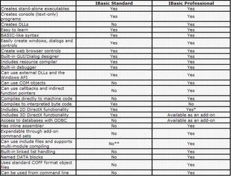 Keywords: Ibasic features.gif A table showing the difference between IBasic Standard and IBasic Professional 2006-09-06 own assumed HiB2Bornot2B BASIC programming language
