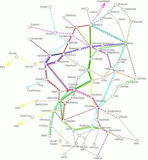 | Keywords: IC 2007.gif Lines of the German Intercity Train Network as of 2006/2007 Reconstructed using an official train time-table from that era which was then available at http //www bahn de Each coloured line on the map corresponds to one train per hour on that line Dashed lines represent one train each two hours Black lines represent extensions of the coloured lines that run only some times a day Not all systematic stops of the network are shown Especially in the Ruhr area Duisburg Bochum Essen Solingen Hagen Most of the hourly and more direct lines are InterCityExpress trains with the notable exception of the red IC Hamburg - Dortmund - Mainz The others are InterCity trains The latter are cheaper and also stop at more additional stations which are not shown on this map Drawing in Vector-Format OpenDocument Draw http //freenet-homepage de/rwp/historische_IC-Netze zip Rail transport maps of Germany InterCity Germany 2007-01-08 own assumed Robert Will |