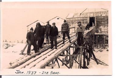 | Keywords: waterways alberta photo border drawing Ice gang workers who would cut ice blocks from the river. Waterways, Alberta, 1937. From the Charles Eymundson fonds, PR2012.0927/281. Ice gang workers who would cut ice blocks from the river. Waterways, Alberta, 1937. From the Charles Eymundson fonds, PR2012.0927/281. |
