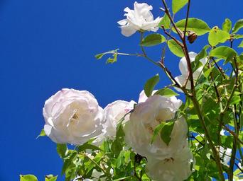 Keywords: iceberg rose flowers white rose flower close close-up petals pollen branches country garden blue sky yorkshire rose
