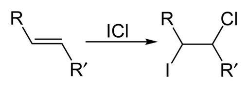 Keywords: ICl-addition-across-alkene-2D-skeletal.png Reaction scheme for the addition of ICl across an alkene Own 2008-03-03 Ben Mills Benjah-bmm27 Images by Ben Mills Halogen addition reactions Iodine monochloride