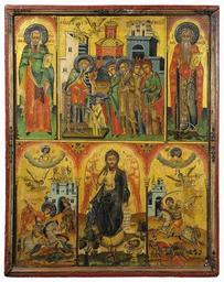 | Keywords: Icon multipart XVII b.jpeg ru Шестичастная икона Вве ху св Афанасий Введение во х ам П есвятой Бого одицы св Ха алампий Внизу св Гео гий Иоанн К еститель св Дмит ий Россия се едина 17-го века 83 5 х 66 5 см de Bedeutende Sechs-Felder-Ikone Oben links Athanasios der Athonite; lebte ab um 958 auf dem Athos Gründer der Großen Lavra um 961 mit Spenden des Kaisers Nikephoros Phokas; Typikon des Kaisers Johannes Tzimiskes 971/72 Oben mittig Mariae Einführung in den Tempel Oben rechts Hl Märtyrerbischof Charalampes von Paphlagonien Märtyrer unter Kaiser Septimus Severus 193-210 Unten links Hl Georg über ihm die Gottesmutter in Wolkenfeld Unten mittig Johannes der Täufer mit Schriftrolle Matthäus 3 Vers2 Unten rechts Hl Demetrios von Thessaloniki über ihm Christus in Wolkenfeld Beschriftung in kirchenslawischen Buchstaben Kupferne Risas mit feiner Patina Russland Mitte 17 Jh 83 5 x 66 5 cm century 17 http //www zeller de/de/katalog/auktion-86-sept-05/auktionsartikel/bedeutende-sechs-felder-ikone/ PHPSESSID ad33babf8ede88142e1b2c52bf6fa166 zeller de 17 PD-Art-100 Icons of Saint George and the Dragon 1650 Uploaded with UploadWizard Icons of John the Baptist Demetrius Day Icons of Saint Demetrius Horseman Icons of Presentation of Virgin Mary Icons of Saint Athanasius Saint Charalampus Multiple-images icons |