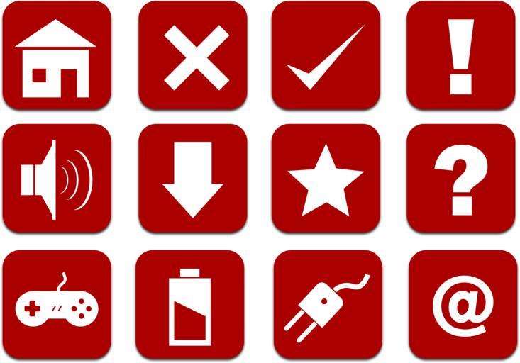 Keywords: icons set red home cancel check attention warning download speaker volume favorite star help question games battery power energy email plug delete remove gui