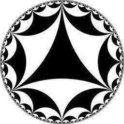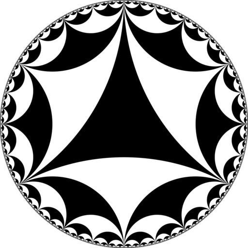 | Keywords: Ideal-triangle hyperbolic tiling.svg validSVG en The Poincaré disc model of the hyperbolic plane tiled with ideal triangles See the SVG source for the Haskell program that generated the image own Saric 2010-03-01 Infinite-order triangular tiling |
