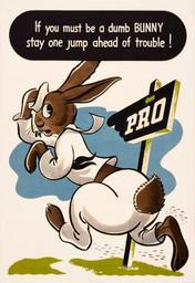 | Keywords: If you must be a dumb bunny..., health education poster, 1945.jpg If you must be a dumb bunny stay one jump ahead of trouble Rabbit in sailor's suit running in direction of sign pointing to prophylactic station pro LOC-image cph 3g04256 Restoration by trialsanderrors http //www flickr com/photos/trialsanderrors/2866106631/ If you must be a dumb bunny health education poster 1945 1945 U S Government Printing Office PD-USGov Condoms World War II venereal disease posters from the United States Anthropomorphic rabbits and hares Rabbits acting as humans in art |