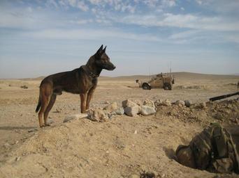 | Keywords: II MHG Military Working Dog Platoon completes Afghanistan tour DVIDS432653.jpg en A military working dog with Military Working Dog Platoon Military Police Support Company II Marine Expeditionary Force Headquarters Group keeps a look out during a mission in Helmand province The platoon supported numerous missions during their seven month deployment to Afghanistan 2011-07-20 Forward https //www dvidshub net/image/432653 110720-N-+++++-004 2011-07-24 05 13 HELMAND PROVINCE AF PD-USGov-Military-Navy Helmand Province in the War in Afghanistan 2001-present Images from DoD uploaded by Fæ |