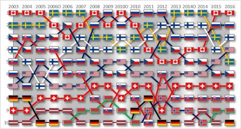 | Keywords: IIHF World Ice Hockey Ranking between 2003 and 2014.png en Graph of the evolution of the top ten men's nations between 2003 and 2014 ru Г афик движения сбо ных в ейтинге с 2003 по 2014 годы own JamesyWamesy Teodor Östlund 2014-05-28 PD-text ;For all flags Insignia ;For flag of Canada PD-ineligible trademark ;For flag of the Czech Republic PD-CzechGov ;For flag of Sweden PD-ineligible ;For flag of Slovakia PD-ineligible ;For flag of Finland PD-FinlandGov ;For flag of Russia PD-RU-exempt PD-shape ;For flag of United States PD-ineligible ;For flag of Switzerland PD-shape ;For flag of Germany PD-simple PD-Flag-Germany ;For flag of Belarus PD-BY-exempt IIHF World Championship |