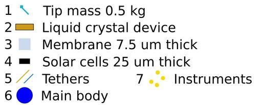 | Keywords: Ikaros solar sail key.svg Ikaros solar sail when unfurled facing the sun Expanded key 1 blue square on a line Tip mass 0 5 kg 1 of 4 2 orange rectangle Liquid crystal device 1 of 80 3 blue square Membrane 7 5 um thick 20 metres diameter 4 black rectangle Solar cells 25 um thick 1 of many 5 yellow and blue lines Tethers 6 blue disc Main body 7 yellow dots Instruments Any rendering problems are probably due to wikimedia software See key with alternative font in File Ikaros solar sail key liberation sans svg; the Opera browser renders all these SVG files fine self-made by 84user after looking at references at http //www jaxa jp/press/2010/06/20100611_ikaros_e html Small Solar Power Sail Demonstrator 'IKAROS' Successful Solar Sail Deployment and JAXA's YouTube video http //www youtube com/watch v 7_6HOqBkP2o 2010-06-12 84user thumb left Alternative key with numbers only thumb left Alternative key with Liberation Sans font in an attempt to find a solution to rendering problems with Inkscape and wikimedia The Opera browser renders all these SVG files fine thumb 300px left Alternative key with Liberation Sans font and saved as plain SVG in an attempt to find a solution to rendering problems with Inkscape and wikimedia The Opera browser renders all these SVG files fine thumb left Sun-facing IKAROS diagram without key thumb 300px left Numbered key to sun-facing IKAROS diagram with DejaVu Sans font; any rendering problems are probably due to wikimedia software The Opera browser renders all these SVG files fine thumb left Sun-facing IKAROS diagram with numbers-only key at bottom thumb 300px left Sun-facing IKAROS diagram plus numbered key with DejaVu Sans font; any rendering problems are probably due to wikimedia software The Opera browser renders all these SVG files fine - 250px Test upload of File Ikaros solar sail key svg saved as Plain SVG - 250px Test upload of File Ikaros solar sail key svg saved as Plain SVG and then manually edited to determine whether https //bugzilla wikimedia org/show_bug cgi id 17845 is related to this problem validSVG http //validator w3 org/check uri Created with Inkscape Diagram legends Legend in English IKAROS Illustrations of spacecraft SVG spaceflight |