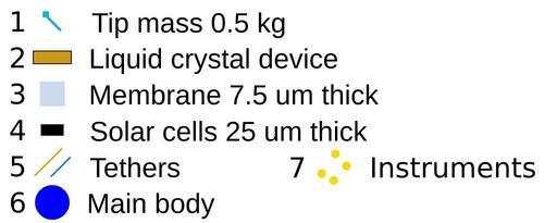 | Keywords: Ikaros solar sail key liberation and dejavu sans.svg Ikaros solar sail when unfurled facing the sun With Liberation Sans font Expanded key 1 blue square on a line Tip mass 0 5 kg 1 of 4 2 orange rectangle Liquid crystal device 1 of 80 3 blue square Membrane 7 5 um thick 20 metres diameter 4 black rectangle Solar cells 25 um thick 1 of many 5 yellow and blue lines Tethers 6 blue disc Main body 7 yellow dots Instruments Any rendering problems are probably due to wikimedia software See key with alternative DejaVu Sans font in File Ikaros solar sail key svg self-made by 84user after looking at references at http //www jaxa jp/press/2010/06/20100611_ikaros_e html Small Solar Power Sail Demonstrator 'IKAROS' Successful Solar Sail Deployment and JAXA's YouTube video http //www youtube com/watch v 7_6HOqBkP2o 2010-06-12 84user thumb left Alternative key with numbers only thumb left Alternative key with Liberation Sans font in an attempt to find a solution to rendering problems with Inkscape and wikimedia The Opera browser renders all these SVG files fine thumb left Sun-facing IKAROS diagram without key thumb left Numbered key to sun-facing IKAROS diagram with DejaVu Sans font thumb left Sun-facing IKAROS diagram with numbers-only key at bottom thumb left Sun-facing IKAROS diagram plus numbered key with DejaVu Sans font thumb left version using Liberation Sans for Instruments text kerning errors validSVG http //validator w3 org/check uri Created with Inkscape Diagram legends Legend in English IKAROS Illustrations of spacecraft SVG spaceflight |