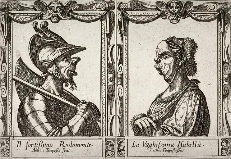 | Keywords: Il fortissimo Rodomonte La Vaghissima Isabella (Antonio Tempesta).jpg Artwork Creator Antonio Tempesta The Very Strong Rodomonte and The Very Faint Isabella El fuertísimo Rodamonte y La muy endeble Isabel Le fort Rodomont et La faible Isabelle Orlando Furioso es Retratos grotescos de Rodamonte e Isabel dos personajes del poema épico renacentista Orlando furioso de Ludovico Ariosto century 16 Etching Size cm 21 6 14 9 Institution Fine Arts Museums of San Francisco Achenbach Foundation place of discovery object history David Tunick 1973; LC verso Marcus Sopher cat 84 Sopher 17th c catalogue no 84A From the same series in AFGA A005654 A005655 A006348 exhibition history credit line Mr and Mrs Marcus Sopher Collection full form title recto la The Very Strong Rodomonte El fuertísimo Rodamonte Le fort Rodamont Il fortissimo Rodomonte full form text recto la Made by Antonio Tempesta Hecho por Antonio Tempesta full form title recto la The Very Faint Isabella La muy endeble Isabel La faible Isabelle La vaghissima Isabella full form text recto la Made by Antonio Tempesta Hecho por Antonio Tempesta accession number 1988 1 212 place of creation Italy https //art famsf org/antonio-tempesta/il-fontissimo-rodomonte-and-la-vaghissima-isabella-series-based-ariostos-orlando Fine Arts Museums of San Francisco https //art famsf org/sites/default/files/artwork/tempesta/3307201301000037 jpg JPG PD-old-auto-1923 1630 Antonio Tempesta - Orlando Furioso |