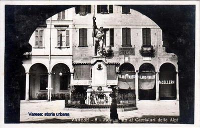 Keywords: Versione in bronzo (1901) della statua di Luigi Buzzi Leone raffigurante i Cacciatori delle Alpi collocata in piazza del Podestà. Alle spalle del monumento a sinistra il palazzo Pretorio (1570-75) e a destra palazzo Biumi (1590). varese