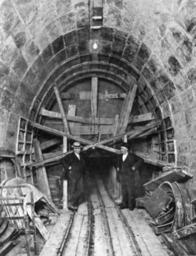 | Keywords: IllinoisTunnelTrunkTunnelConstruction.jpg en Original captions Western Fig 8 View of Trunk Conduit Under Construction and inscribed on bottom of photo 9182 Illinois Telephone and Telegraph Co illegible Trunk System - Franklin Washington Sts Pages Fig 5 VIEW OF TRUNK CONDUIT UNDER CONSTRUCTION This image is a composite of both published versions in order to reduce artifacts from scanning and printing Trunk tunnels were 14 feet high by 12 3/4 feet wide The photo does not show the actual street intersection suggested in the title but the system map in Western Fig 17 suggests that this section of trunk tunnel is near the base of Construction Shaft No 3 on Franklin Since the shaft entrance is not in view the camera must be facing north toward the street intersection George W Jackson Scope Extent and Construction of the Underground Conduits of the Illinois Telephone and Telegraph Co in Chicago http //books google com/books id DJ4PAQAAIAAJ pg PA487 Journal of the Western Society of Engineers Vol VII No 5 Oct 1902 ; page 487 Also published in George W Jackson Underground Conduits in Chicago http //books google com/books id jz4AAAAAMAAJ pg PA323 Page's Magazine Vol II No 4 April 1903 ; page 323 George W Jackson died 1922 First published 1902-10 41 52 57 94 N 87 38 7 14 W region US-IL_heading N Chicago Tunnel Company Chicago in the 1900s Tunnel construction PD-old |