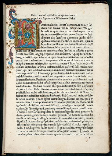 | Keywords: incunables incunabula illumination 15th century 15thcentury fifteenth century fifteenthcentury rubrication manuscript fragments manuscriptfragments bookbinding text document photo border writing Leo I, Sermones (Venice: Lucas Dominici F., Venetus, 7 Aug. 1482), leaf a4r. qRInc LEO Serm 1482. The decoration here extends into the inner margin with acanthus leaves and gold bezants (small circular ornaments). Planning for the decoration was carried out before the book went through the printing press as the printer needed to know where and how much space to leave. Leo I, Sermones (Venice: Lucas Dominici F., Venetus, 7 Aug. 1482), leaf a4r. qRInc LEO Serm 1482. The decoration here extends into the inner margin with acanthus leaves and gold bezants (small circular ornaments). Planning for the decoration was carried out before the book went through the printing press as the printer needed to know where and how much space to leave. |