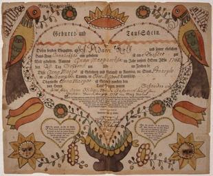 | Keywords: Illustrated family record (Fraktur) found in Revolutionary War Pension and Bounty-Land-Warrant Application File... - NARA - 300195.tif Scope and content Illustrated family record in German Birth and Baptismal record by F Krebs no date hand-colored with large birds General notes Original Located at TR3280 300195 Local identifier Department of the Interior Bureau of Pensions 1849 - 1930 Most Recent <br /> War Department Office of the Secretary 1789 - 09/18/1947 Predecessor <br /> War Department Military Bounty Lands and Pension Branch ca 1810 - 1815 Predecessor Archives I Reference Section Textual Archives Services Division NWCT1R National Archives Building 7th and Pennsylvania Avenue NW Washington DC 20408 other date circa 1800 1900 Record group Record Group 15 Records of the Department of Veterans Affairs 1773 - 2007 Record group ARC 344 Case Files of Pension and Bounty-Land Warrant Applications Based on Revolutionary War Service compiled ca 1800 - ca 1912 documenting the period ca 1775 - ca 1900 Series ARC 300022 File unit Revolutionary War Pension and Bounty-Land-Warrant Application File W3079 for Philip Frey Pennsylvania ca 1800 - ca 1900 File unit ARC 300194 Variant control numbers NAIL Control Number NWCTB-15-NM22E19-W3079-SLIDE18<br /> NAIL Control Number NWDT1-15-NM22E19-W3079-SLIDE18 yes Other versions <gallery> File Illustrated_family_record_ Fraktur _found_in_Revolutionary_War_Pension_and_Bounty-Land-Warrant_Application_File _-_NARA_-_300195 tif tif File Illustrated_family_record_ Fraktur _found_in_Revolutionary_War_Pension_and_Bounty-Land-Warrant_Application_File _-_NARA_-_300195 jpg jpg </gallery> NARA-cooperation PD-USGov Fraktur Family historical documents of the United States Documents in German NARA TIF images with categorized JPGs |