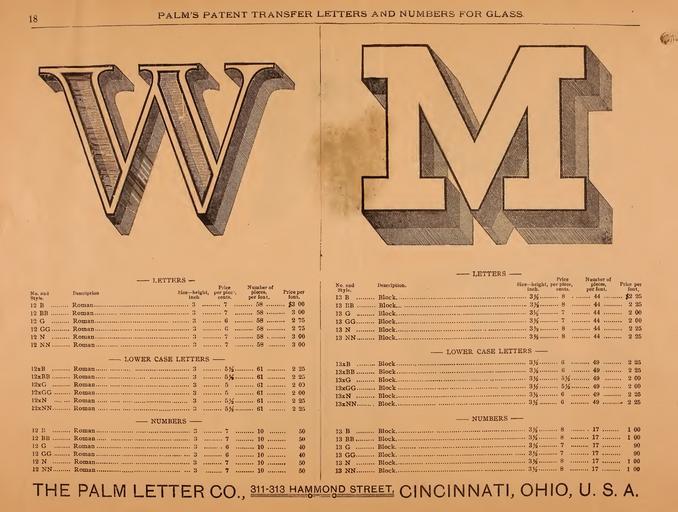 MAKE A MEME View Large Image Public Domain Book:Illustrated sample book & price list of Palm's patent transfer letters ornaments & trade designs for signs, wagons, cars, machines, etc manufactured by the Palm Letter Co Published 1901 in Cincinnati . ...