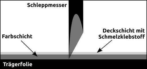 | Keywords: Illustration flex-foil cutting-plotter german.svg en Illustration of the layers of flex flock foils used in textile printing carrier foil colour coat covering layer including hot melt In the middle of the picture you see the blade of a drag-nife cutting plotter which cuts contours into the colour coat and the covering layer while the carrier foil remains undamaged de Illustration der Schichten von Flex- und Flockfolien die im Textildruck Anwendung finden Trägerfolie Farbschicht Deckschicht mit Schmelzklebstoff In der Mitte des Bildes ist die Klinge eines Schleppmesser-Schneideplotters zu sehen mit der Konturen in die Farb- und Deckschicht geschnitten werden während die Trägerfolie unbeschädigt bleibt own Stefan Nagy 2010-01-21 File Illustration flex-foil cutting-plotter english svg Cc-zero Plotters Textile printing Functional principles |