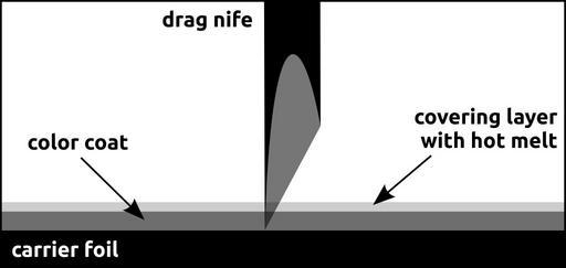 | Keywords: Illustration flex-foil cutting-plotter english.svg en Illustration of the layers of flex flock foils used in textile printing carrier foil colour coat covering layer including hot melt In the middle of the picture you see the blade of a drag-nife cutting plotter which cuts contours into the colour coat and the covering layer while the carrier foil remains undamaged de Illustration der Schichten von Flex- und Flockfolien die im Textildruck Anwendung finden Trägerfolie Farbschicht Deckschicht mit Schmelzklebstoff In der Mitte des Bildes ist die Klinge eines Schleppmesser-Schneideplotters zu sehen mit der Konturen in die Farb- und Deckschicht geschnitten werden während die Trägerfolie unbeschädigt bleibt own Stefan Nagy 2011-02-24 File Illustration flex-foil cutting-plotter german svg Cc-zero Plotters Textile printing Functional principles |