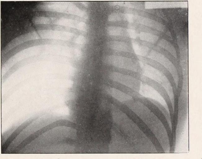 | Keywords: bookid:transactionsofa3119amer_0 bookidtransactionsofa3119amer0 bookyear:1915 bookyear1915 bookdecade:1910 bookdecade1910 bookcentury:1900 bookcentury1900 bookauthor:american_climatological_and_clinical_association bookauthoramericanclimatologicalandclinicalassociation booksubject:climate booksubjectclimate booksubject:medicine booksubjectmedicine bookpublisher:_philadelphia__american_climatological_and_clinical_association bookpublisherphiladelphiaamericanclimatologicalandclinicalassociation bookcontributor:columbia_university_libraries bookcontributorcolumbiauniversitylibraries booksponsor:national_endowment_for_the_humanities__neh_ booksponsornationalendowmentforthehumanitiesneh bookleafnumber:204 bookleafnumber204 bookcollection:columbiauniversitylibraries bookcollectioncolumbiauniversitylibraries bookcollection:medicalheritagelibrary bookcollectionmedicalheritagelibrary bookcollection:americana bookcollectionamericana abstract photo border texture bookid:transactionsofa3119amer_0 bookidtransactionsofa3119amer0 bookyear:1915 bookyear1915 bookdecade:1910 bookdecade1910 bookcentury:1900 bookcentury1900 bookauthor:american_climatological_and_clinical_association bookauthoramericanclimatologicalandclinicalassociation booksubject:climate booksubjectclimate booksubject:medicine booksubjectmedicine bookpublisher:_philadelphia__american_climatological_and_clinical_association bookpublisherphiladelphiaamericanclimatologicalandclinicalassociation bookcontributor:columbia_university_libraries bookcontributorcolumbiauniversitylibraries booksponsor:national_endowment_for_the_humanities__neh_ booksponsornationalendowmentforthehumanitiesneh bookleafnumber:204 bookleafnumber204 bookcollection:columbiauniversitylibraries bookcollectioncolumbiauniversitylibraries bookcollection:medicalheritagelibrary bookcollectionmedicalheritagelibrary bookcollection:americana bookcollectionamericana abstract photo border texture bookid:transactionsofa3119amer_0 bookidtransactionsofa3119amer0 bookyear:1915 bookyear1915 bookdecade:1910 bookdecade1910 bookcentury:1900 bookcentury1900 bookauthor:american_climatological_and_clinical_association bookauthoramericanclimatologicalandclinicalassociation booksubject:climate booksubjectclimate booksubject:medicine booksubjectmedicine bookpublisher:_philadelphia__american_climatological_and_clinical_association bookpublisherphiladelphiaamericanclimatologicalandclinicalassociation bookcontributor:columbia_university_libraries bookcontributorcolumbiauniversitylibraries booksponsor:national_endowment_for_the_humanities__neh_ booksponsornationalendowmentforthehumanitiesneh bookleafnumber:204 bookleafnumber204 bookcollection:columbiauniversitylibraries bookcollectioncolumbiauniversitylibraries bookcollection:medicalheritagelibrary bookcollectionmedicalheritagelibrary bookcollection:americana bookcollectionamericana abstract photo border texture Identifier: transactionsofa3119amer_0 Title: Transactions of the American Climatological and Clinical Association. Year: 1915 (1910s) Authors:  American Climatological and Clinical Association Subjects:  Climate Medicine Publisher:  [Philadelphia] American Climatological and Clinical Association Contributing Library:  Columbia University Libraries Digitizing Sponsor:  National Endowment for the Humanities (NEH)   View Book Page: Book Viewer About This Book: Catalog Entry View All Images: All Images From Book  Click here to view book online to see this illustration in context in a browseable online version of this book.   Text Appearing Before Image: isproportionate to those of quiet breathing, andtheir relative values have always been consistently main-tained. Because of this feature and the subjective symptomsthe mean pressure was reduced to o, or a little less. Thisreduction lessened the sense of fatigue somewhat, and thepulse, which had averaged 90, fell to a steady rate of 80 aftertwo weeks. The sputum, small in amount, was but littleinfluenced. The physical signs in the right upper lobe havediminished somewhat. The general condition of the patienthas materially improved, and apprehension has gone. Skia-grams (figs. 1 and 2) show a marked displacement of theheart after the refill, which is materially more marked onexpiration than on inspiration. There is a lateral adhesionseen about the fourth rib, but no diaphragmatic adhesion.The fluoroscope shows the greatest movement of the heartwith respiration when there is a large amount of gas. Thelung is not completely collapsed immediately after a refill. Fig. I.—Full inspiration.  Text Appearing After Image: Fig. 2.—Full expiration. Movable Mediastinum.—Skiagrams of chest taken third day afterApril 3, 1915. See Case I, Chart I. refill of MOVABLE MEDIASTINUM AND THE MANOMETER l6l The yielding of the mediastinum, therefore, makes completecollapse a doubtful possibility or possible only at considerablerisk. The phenomenon was present during the first five fill-ings, and then disappeared until the ninth filling, since whichtime it has been usually present (see Chart I, b, c, d,).Through the fluoroscope the diaphragm was seen to rise in ajerky manner when the breath was held on inspiration. Case 2. — Movable mediastinum becoming fixed.(Chart II.) No. 27, female. Right lung collapsed for severeand long-standing disease. Left lung : slight disseminateddisease throughout upper lobe. September 21, 1914.—Initial operation, adhesions present,200 c.c. gas. Two days later gas easily introduced, two setsof stationary points noted (Chart II, a) with the meanpressures at approximately -20 and -5   Note About Images Please note that these images are extracted from scanned page images that may have been digitally enhanced for readability - coloration and appearance of these illustrations may not perfectly resemble the original work. Identifier: transactionsofa3119amer_0 Title: Transactions of the American Climatological and Clinical Association. Year: 1915 (1910s) Authors:  American Climatol