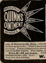 | Keywords: bookid:breedersportsma501907sanf bookidbreedersportsma501907sanf bookyear:1882 bookyear1882 bookdecade:1880 bookdecade1880 bookcentury:1800 bookcentury1800 booksubject:horses booksubjecthorses bookpublisher:san_francisco__calif_____s_n__ bookpublishersanfranciscocalifsn bookcontributor:san_francisco_public_library bookcontributorsanfranciscopubliclibrary booksponsor:california_state_library_califa_lsta_grant booksponsorcaliforniastatelibrarycalifalstagrant bookleafnumber:228 bookleafnumber228 bookcollection:americana bookcollectionamericana bhl collection bhlcollection text bookid:breedersportsma501907sanf bookidbreedersportsma501907sanf bookyear:1882 bookyear1882 bookdecade:1880 bookdecade1880 bookcentury:1800 bookcentury1800 booksubject:horses booksubjecthorses bookpublisher:san_francisco__calif_____s_n__ bookpublishersanfranciscocalifsn bookcontributor:san_francisco_public_library bookcontributorsanfranciscopubliclibrary booksponsor:california_state_library_califa_lsta_grant booksponsorcaliforniastatelibrarycalifalstagrant bookleafnumber:228 bookleafnumber228 bookcollection:americana bookcollectionamericana bhl collection bhlcollection text Identifier: breedersportsma501907sanf Title: Breeder and sportsman Year: 1882 (1880s) Authors: Subjects: Horses Publisher: San Francisco, Calif. : [s.n.] Contributing Library: San Francisco Public Library Digitizing Sponsor: California State Library Califa/LSTA Grant View Book Page: Book Viewer About This Book: Catalog Entry View All Images: All Images From Book Click here to view book online to see this illustration in context in a browseable online version of this book. Text Appearing Before Image: TelephoneTemporary 1883 511 Market St., San Francisco ■ Text Appearing After Image: TahQ.lt In Time If you have the remedy on hand, and are ready toact promptly, you Trill find that there is nothing inthe form of Spavins, Splints, Curbs. Windpuffs andBunches which will not yield promptly and perma-nently to Quinns Ointment It has saved thousands of (rood horses from the peddlers cart and the broken-down, horse market. Mr. C. B. Dicte* I ena of Minneapolis, Minn., who conducts one of the largest livery stables in the Northwest, vrites as follows: I have been using Qulnns Ointment lor some time and with the greatest uccess. I take pleasure in recommending it to my friends. No borsemarishould be with- .ut it in bis stable. For curbs, splints, spavins, windpuffs and all bunches it- has no eqnaL Prico 91.00 porfaoiile. Sold by all druggists orsentby mail. Write us for (areolars, | fSEKKasl£PSent W. B. Eddy & Go., Whitehall, N. Y* Note About Images Please note that these images are extracted from scanned page images that may have been digitally enhanced for readability - coloration and appearance of these illustrations may not perfectly resemble the original work. Identifier: breedersportsma501907sanf Title: Breeder and sportsman Year: 1882 (1880s) Authors: Subjects: Horses Publisher: San Francisco, Calif. : [s.n.] Contributing Library: San Francisco Public Library Digitizing Sponsor: California State Library Califa/LSTA Grant View Book Page: Book Viewer About This Book: Catalog Entry View All Images: All Images From Book Click here to view book online to see this illustration in context in a browseable online version of this book. Text Appearing Before Image: TelephoneTemporary 1883 511 Market St., San Francisco ■ Text Appearing After Image: TahQ.lt In Time If you have the remedy on hand, and are ready toact promptly, you Trill find that there is nothing inthe form of Spavins, Splints, Curbs. Windpuffs andBunches which will not yield promptly and perma-nently to Quinns Ointment It has saved thousands of (rood horses from the peddlers cart and the broken-down, horse market. Mr. C. B. Dicte* I ena of Minneapolis, Minn., who conducts one of the largest livery stables in the Northwest, vrites as follows: I have been using Qulnns Ointment lor some time and with the greatest uccess. I take pleasure in recommending it to my friends. No borsemarishould be with- .ut it in bis stable. For curbs, splints, spavins, windpuffs and all bunches it- has no eqnaL Prico 91.00 porfaoiile. Sold by all druggists orsentby mail. Write us for (areolars, | fSEKKasl£PSent W. B. Eddy & Go., Whitehall, N. Y* Note About Images Please note that these images are extracted from scanned page images that may have been digitally enhanced for readability - coloration and appearance of these illustrations may not perfectly resemble the original work. Identifier: breedersportsma501907sanf Title: Breeder and sportsman Year: 1882 (1880s) Authors: Subjects: Horses Publisher: San Francisco, Calif. : [s.n.] Contributing Library: San Francisco Public Library Digitizing Sponsor: California State Library Califa/LSTA Grant View Book Page: Book Viewer About This Book: Catalog Entry View All Images: All Images From Book Click here to view book online to see this illustration in context in a browseable online version of this book. Text Appearing Before Image: TelephoneTemporary 1883 511 Market St., San Francisco ■ Text Appearing After Image: TahQ.lt In Time If you have the remedy on hand, and are ready toact promptly, you Trill find that there is nothing inthe form of Spavins, Splints, Curbs. Windpuffs andBunches which will not yield promptly and perma-nently to Quinns Ointment It has saved thousands of (rood horses from the peddlers cart and the broken-down, horse market. Mr. C. B. Dicte* I ena of Minneapolis, Minn., who conducts one of the largest livery stables in the Northwest, vrites as follows: I have been using Qulnns Ointment lor some time and with the greatest uccess. I take pleasure in recommending it to my friends. No borsemarishould be with- .ut it in bis stable. For curbs, splints, spavins, windpuffs and all bunches it- has no eqnaL Prico 91.00 porfaoiile. Sold by all druggists orsentby mail. Write us for (areolars, | fSEKKasl£PSent W. B. Eddy & Go., Whitehall, N. Y* Note A
