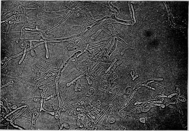 <em>Fig. 321.—Blastomyces dermatitidis. Budding forms and mycelial growths from glucose agar (Irons and Graham, in "Journal of Infectious Diseases"). a few weeks the agar-agar begins to turn yellow and later may be- come brown, though the growth itself remains white and unchanged. The growth is firmly attached to the agar. When old, the growth wrinkles. Bouillon.—The growth is not luxuriant. The medium is not clouded and contains fluffy flocculi of stringy viscid material. Sugars added to the medium may be fermented. Gelatin.—Growth takes place with aerial hypha. Liquefaction does not occur or is very slow. Potato.—Abundant growth with aerial hypha. Milk.—Not coagulated, not acidified, slowly digested. There is some diflSculty in describing the cultures, as different authors describe them quite differently, evidently having different organisms or different strains under observation.</em>