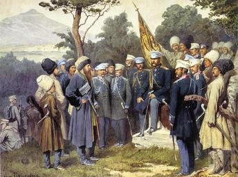 View Original:Imam_Shamil_surrendered_to_Count_Baryatinsky_on_August_25,_1859_by_Kivshenko,_Alexei_Danilovich.jpg (874x650)