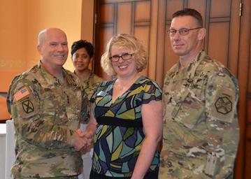 | Keywords: people indoor Lt. Gen. Kenneth R. Dahl, IMCOM commander, recognizes Tawny Jimeno, Family, Morale, Welfare and Recreation, for superior performance. (Photo by Ignacio "Iggy"Rubalcava, USAG Rheinland-Pfalz PAO) Lt. Gen. Kenneth R. Dahl, IMCOM commander, recognizes Tawny Jimeno, Family, Morale, Welfare and Recreation, for superior performance. (Photo by Ignacio "Iggy"Rubalcava, USAG Rheinland-Pfalz PAO) | ||||