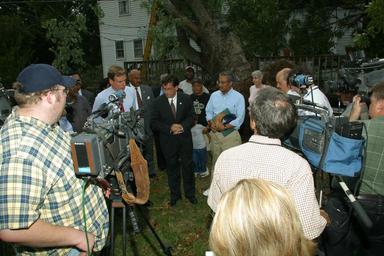 | Keywords: outdoor Governor Mark R. Warner (left) visits a Richmond neighborhood after Hurricane Isabel, assessing the damages and speaking with citizens, September 22, 2003. With U.S. Representative Eric Cantor (R-7th District (center) and U.S. Representative Bobby Scott (D-3rd District) (right). Governor Mark R. Warner, Press Office records, 2001-2006 (bulk 2002-2006), accession 42460, Box 64 cd 2, 9-22-03 Tour of Richmond\205CANON Governor Mark R. Warner (left) visits a Richmond neighborhood after Hurricane Isabel, assessing the damages and speaking with citizens, September 22, 2003. With U.S. Representative Eric Cantor (R-7th District (center) and U.S. Representative Bobby Scott (D-3rd District) (right). Governor Mark R. Warner, Press Office records, 2001-2006 (bulk 2002-2006), accession 42460, Box 64 cd 2, 9-22-03 Tour of Richmond\205CANON |