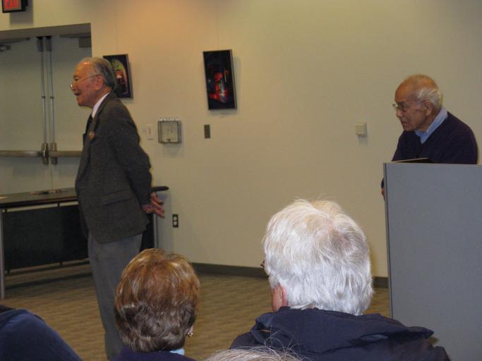 Keywords: kalamazoo library community reading wwii internment service indoor On Thursday, March 25, 2010, guest speakers Dr. Iwao Ishino, professor of anthropology, and Dr. Sadayoshi Omoto, professor of art, both retired from Michigan State University, shared their stories of internment in a WRA camp and WWII military intelligence service. Dr. Takashi Yoshida, Western Michigan University professor of history, was moderator. www.kpl.gov/reading-together/2010/ On Thursday, March 25, 2010, guest speakers Dr. Iwao Ishino, professor of anthropology, and Dr. Sadayoshi Omoto, professor of art, both retired from Michigan State University, shared their stories of internment in a WRA camp and WWII military intelligence service. Dr. Takashi Yoshida, Western Michigan University professor of history, was moderator. www.kpl.gov/reading-together/2010/