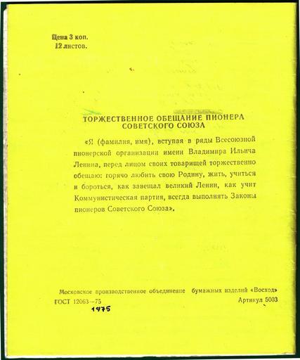 Keywords: Торж.обещание пионера СССР.jpg То жественное обещание пионе а Советского Союза 4-я ст обложки школьной тет ади Типог афия Восход и ее склады в 1975 асполагались в Хамовниках по Олсуфьевскому п оезду Back side of a standard Soviet schoolchildren's scrapbook with the text of the Pledge of Young Pioneers It was printed in a printshop in Khamovniki Moscow not earlier than 1975 own scan 1975 USSR PD-RU-exempt PD-trivial only text Young Pioneer organization of the Soviet Union Olsufyevsky Lane