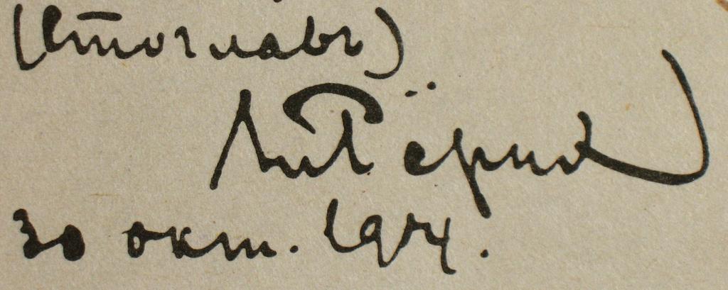| Keywords: Рерих Николай автограф.jpg  Nikolai Rerich signature 1904 или 1914 ru Автог аф и записка  иколая Ре иха В книге  Ре их О вечном  изд Республика Библиотека этической мысли 1994 ти 30000 ст аница 2 own photo 1904-10-30 or 1914-10-30 Nikolai Rerich PD-RusEmpire before 1917 PD-trivial signature Russia Nicholas Roerich Signatures of painters from Russia |