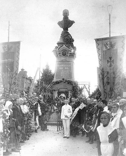 | Keywords: Відкриття пам'ятника І. Котляревському в Полтаві (1903).jpg uk Відк иття пам'ятника І Котля евському Полтава 1903 1903-09-12 http //incognita day kiev ua/img/blogs/kotliar/kotliarevskyi-123-111 jpg from Літе ату но-мемо іальний музей І П Котля евського author PD-RusEmpire Bust of Ivan Kotlyarevsky in Poltava |