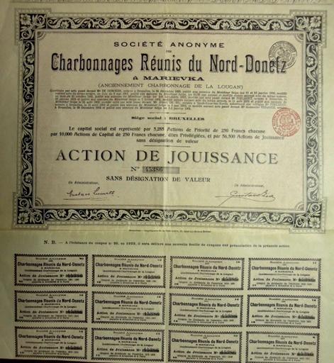 | Keywords: Акция. Объединение угольных шахт севера Донецкого края в Марьевке.jpg Акция Объединение угольных шахт севе а Донецкого к ая в а ьевке Charbonnages reunis du Nord-Donetz http //infodon org ua/postal/281 < 1917 author PD-RusEmpire Stock certificates from Donetsk Oblast Files uploaded by Andrew Butko from various sources Images from infodon org ua | ||||