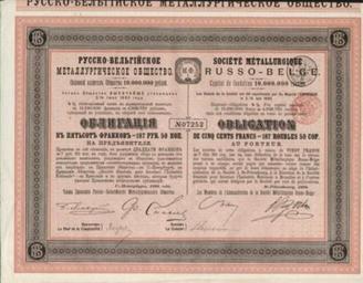 | View Original: | Русско-бельгийское металлургическое общество. Облигация в 187 рублей 50 копеек.jpg (500x390) | |||