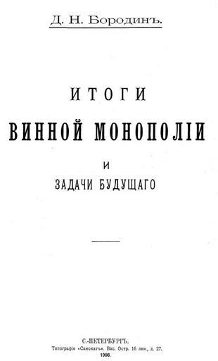 Keywords: Бородин Д. Н. Итоги винной монополии и задачи будущего. (1908) — Титульный лист.jpg PDF Book Титульный лист unknown Image page PD-RusEmpire User Senapa/TemplateSenapaAlc Literary works by Dmitry N Borodin Books from Russia 1908 Title pages uploaded by Steven Pavlov from various sources |